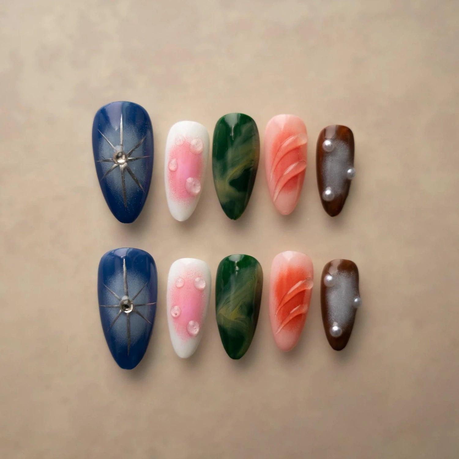 Inspired by the electric vibes and hues of the night. Featuring a cosmic star, airy gradients, 3D droplets and pearls. Nails length: 18-23mm.